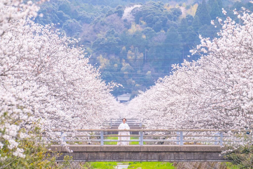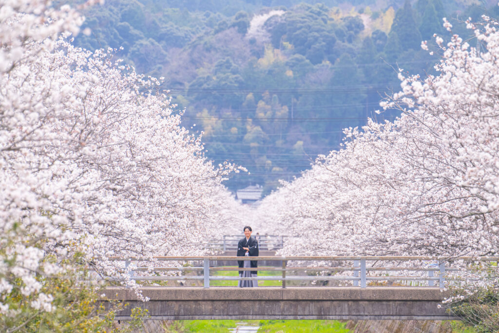 満開の桜の下で白無垢姿の撮影からスタート。